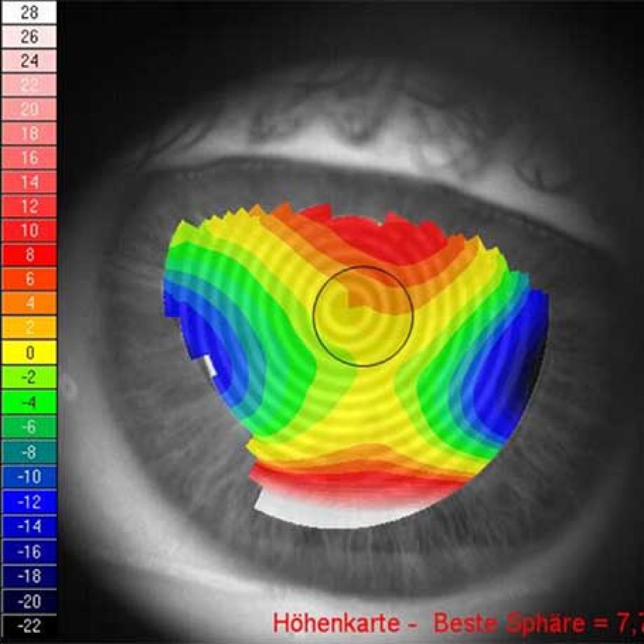 unregelmäßige Hornhautveränderungen aufgedeckt werden. Außerdem ist eine Hornhauttopographie unerlässlich für eine präzise Kontaktlinsenanpassung.