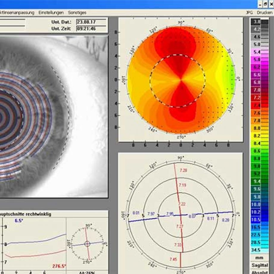 unregelmäßige Hornhautveränderungen aufgedeckt werden. Außerdem ist eine Hornhauttopographie unerlässlich für eine präzise Kontaktlinsenanpassung.